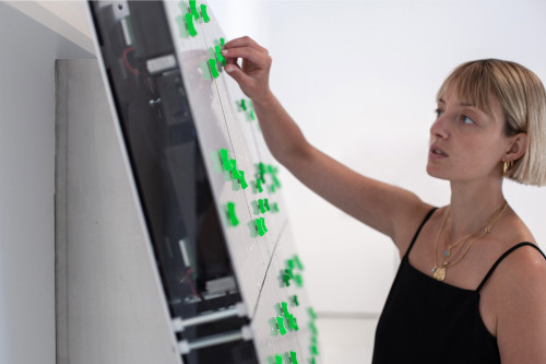 The artwork features a console with a matrix of 80 motorised sliders reminiscent of a control room. Each slider corresponds to a variable, with its name engraved on a plate. At the ends of the sliders, the "+" and "-" signs indicate the stakes or values.