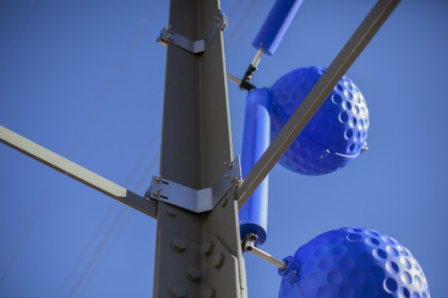 MARKERS is a monumental 17-meter-high sculpture installed on a high-voltage power line pylon — a first in Switzerland. Drawing on the aesthetics of the digital world and the algorithmic vision of machines, the work functions as an assisted ready-made, composed of recycled aerial marker balls. It draws attention to two crucial issues: energy supply and the impact of infrastructure on the natural landscape.