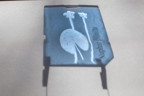 Les trois plantes présentées sont une: “Apium nodiflorum”, une espèce “fortement menacée”, une “Papaver occidentale” un type de pavot “menacé” et une “Dryopteris cristata” une plante considérée comme “vulnérable” par la liste rouge des plantes menacées en Suisse. La couleur bleu de l'ombre projetée fait écho à un effet de cyanotype (premier procédé photographique monochrome négatif de 1842 par lequel on obtient un tirage photographique bleu de Prusse, le premier cyanotype fut l'image d'un herbier composé d'algues par Anna Atkins).