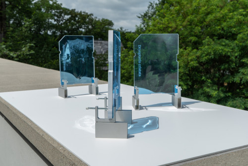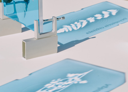 Cette pièce poétique prend la forme d’un triptyque de plaques de plexiglas bleues transparentes. D’apparence normale - hormis de légères ondulations sur leur surface - ces vitres, en forme de carte mémoire SD, révèlent et projettent sur une surface - grâce à la lumière du soleil qui les traverse - des silhouettes de plantes composées d’ombre et de lumière. Chaque vitre accueille l’image d’un type de plantes locales en voie d'extinction que le réchauffement climatique ou la destruction d'habitats naturels pourraient, à terme, faire définitivement disparaître. Des lettres sont également gravées dans le plexiglass, elles correspondent au nom latin de chaque plante.