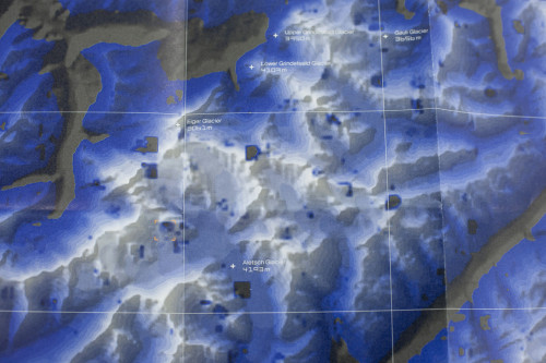 Selon les scientifiques, au cours des dix dernières années, les glaciers suisses ont perdu 20% de leur volume. Cette carte imprimée est une réinterprètation de ce phénomène. Elle a été réalisée à partir des données enregistrées à l'intérieur de l'installation "Artificial Arcadia, mesured and adjustable (?) landscapes", une œuvre réalisée par Fragmentin en collaboration avec les architectes KOSMOS. Elle a été comissionée par Pro Helvetia lors de la Quadriennale de Prague de Performance Design and Space 2019.